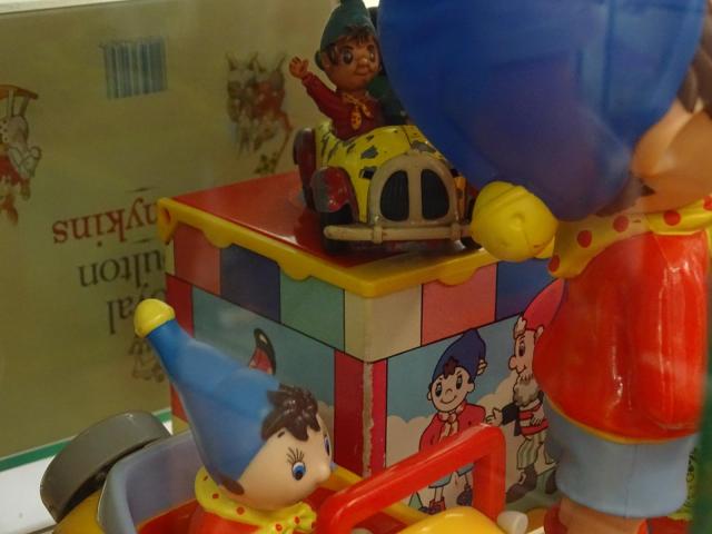Then there was a whole shelf of Noddy things. Two soft dolls, a large figurine, a jack-in-the-box toy (which can be seen better in a later photo) with a battered Noddy car on top, three more Noddy cars, a kaleidoscope and a round tray which I think is one of those toys where you have to get little silver balls into the holes.