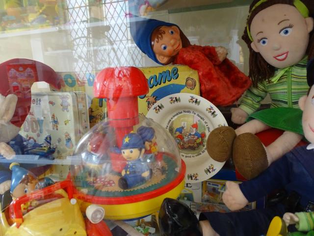 You can see that the shelf is labelled merely ‘Toys, 1950-1997’ as there were some non-Noddy things like the tiger in there too. (You can see there are Postman Pat toys below, and also my mum and Brodie through the case!)