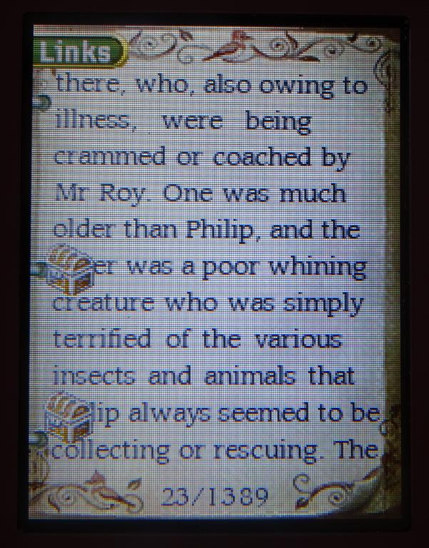 There are some nice touches, for example the smooth animation of the pages is accompanied by a pleasant and varying page-turning sound effect. Navigating through the book is easy as you can turn one page at a time, use the contents list accessible at the beginning of each chapter to move through the book or you can scroll across a bar at the bottom to jump back and forth. However you are reading it on two rather small screens (three inches on the diagonal) and while that didn’t strain my (reasonably) youthful eyesight, the fact that so little fits on a page means there are over 1,300 pages! My hardback edition has 327, the equivalent paperback 276.