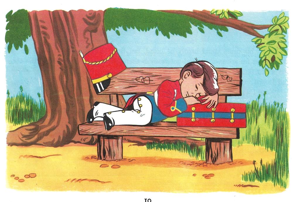 Bom Goes Adventuring tells us a little about Bom – he lives in a toy fort which is run by Captain Bang, and he is the drummer-boy. Having read the synopsis of the first novel in the Bom series (Bom the Little Toy Drummer) this picture-strip seems to be a very truncated retelling of that story – of how Bom is locked up and punished for being a terrible shot (and other misdemeanours in the full story), and then how he escapes in his drum to go off on his adventures.