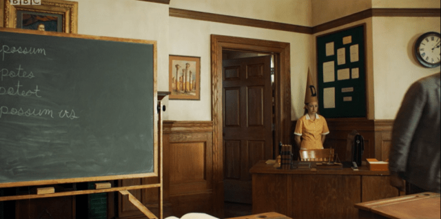 So that leaves Matron plugging the hole with her finger for ages, then using a tissue, leading to the drip becoming a pour and and finally her being soaked as the ceiling collapses. My notes from this scene simply read hahaha Matron. But honestly, she’s the absolute dunce of the episode. It’s a 1940s school, there must be plenty of buckets around, she could have stuck one under the drip and gone to get the caretaker herself. I was literally shouting at the TV GET A BUCKET, MATRON!!