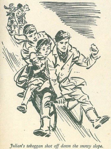 So the next morning they set off – Aily deigning to wear a hat and scarf only because they are they same as Julian has on. It’s funny as she complains that tobogganing makes her nose cold, but as the others point out surely she’s cold all over already.