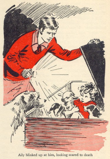 With her she has a little dog, and a lamb. All three are pretty wary of the two boys, though the dog is able to be tempted with a little ham. The lamb then wanders over and Dick, in a unusual move for him, takes hold of it and won’t let it go unless the girl comes to talk to them. He might do something like that in the midst of a mystery, when finding out a bit of information might be crucial, but otherwise it doesn’t seem very like Dick, even if he is very gentle with the creature.