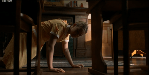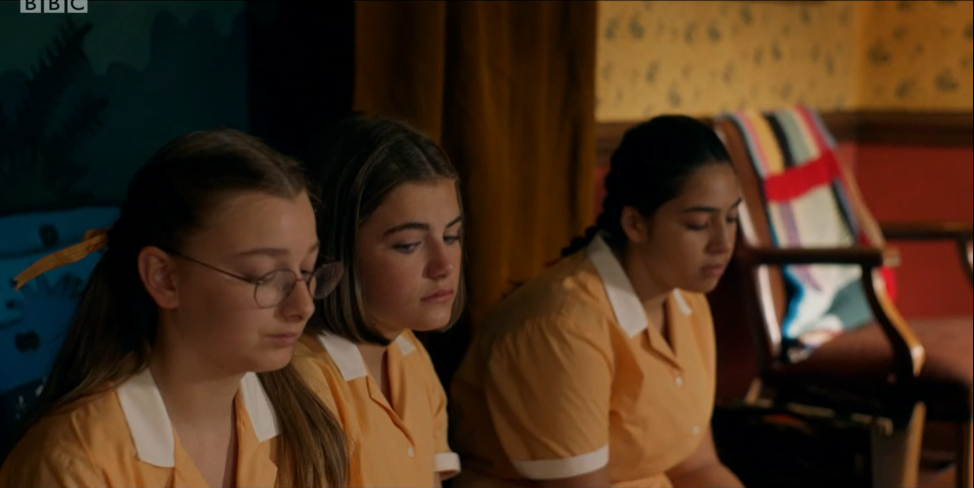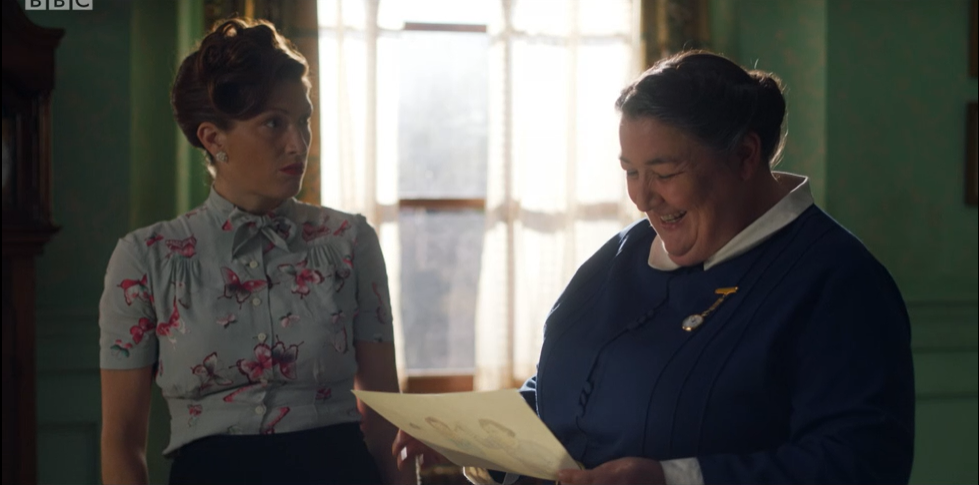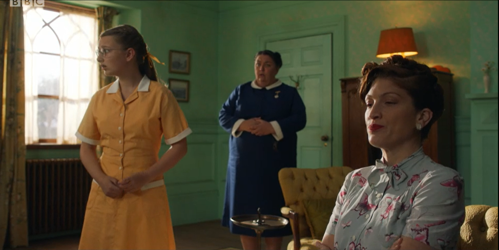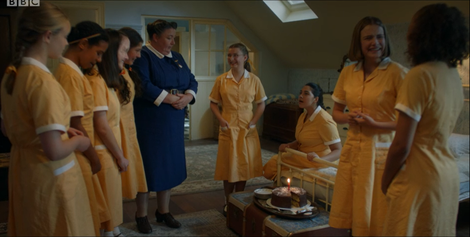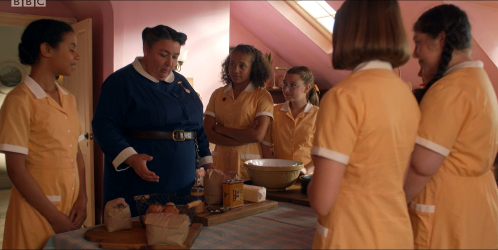 They then make the cake in the attic room where they do their painting, music, try on debutante dresses etc. I thought it seemed an odd choice (but they only seem to have seven sets), as although the mixing is easily done anywhere it still has to be baked. Later we see Matron with the iced cake back in the attic room, so either there’s an oven up there or she carted it up and down the stairs. This is when she can’t resist eating a big slice (her internal battle is a treat to watch).