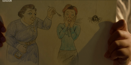 And so it becomes very clear now that Mary-Lou is taking on Belinda’s plots. In the book Belinda draws the two Mam’zelles trying to murder each other, as they are driving the girls mad fighting over who will act in the French play. The two Mam’zelles have a long history of not getting along but I can’t recall if Mam’zelle and Matron have the same sort of attitude, or if Mam’zelle had to face a spider in the last series/episodes. If anyone’s spotted anything like that as a background to the drawing, let me know!