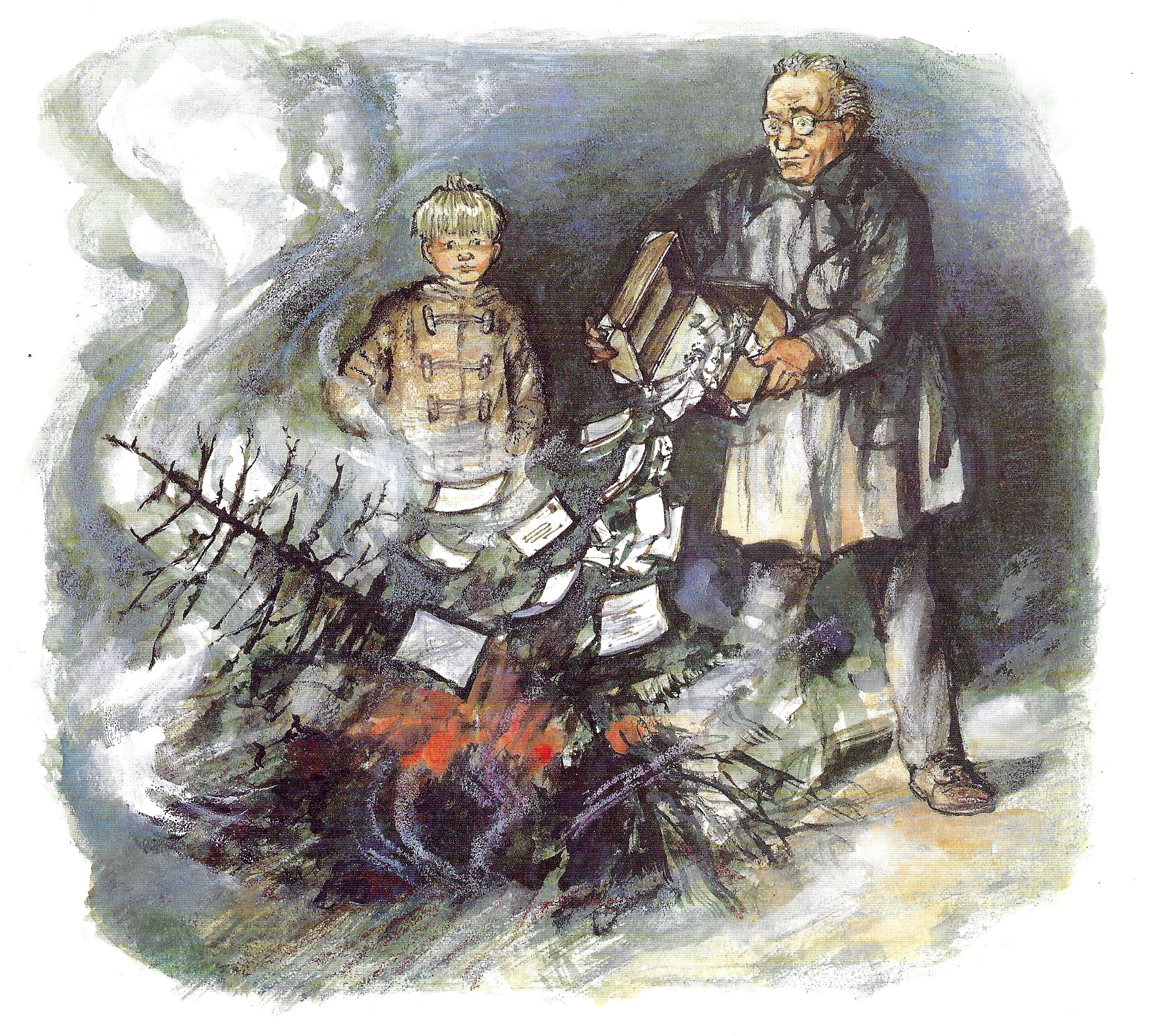 - Burning the Tree. I misremembered this as an Alfie story, but it is about a boy called William and his grandpa. William spends a lot of time in Grandpa’s room, hearing stories about his youth, but there’s a mysterious box that Grandpa has never shown him. One day William sneaks a look inside and is disappointed to find it’s just old letters. He feels guilty for snooping, though. When it is time to burn the old Christmas Tree Grandpa throws on the letters too, which surprises William. He admits to having taken a look and Grandpa doesn’t mind, he just says that his memories are in his head and the letters themselves aren’t important.