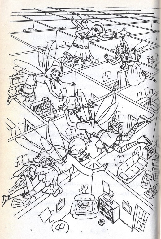 The land (no I won’t be capitalising land every time like the book does) the fairies go into is Sleepover Land, where hundreds of identical girls (the “sleepees”) are having sleepovers in groups of eight. The whole land is made up of room after room set up for sleepovers, and the day lasts just a few minutes, then a new sleepover begins. The goal is for the girls to have fun and stay up all night, then switch to a new room for a differently-themed sleepover.