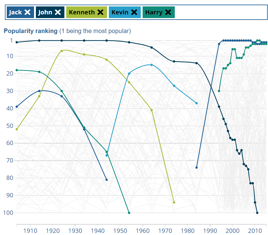 And lastly for the boys, Ronnie actually charts between 2013 and 15 (along with Reggie which I included just for fun!), while Richard leaves the top 10 in the 90s and is out of the chart by the 2000s.