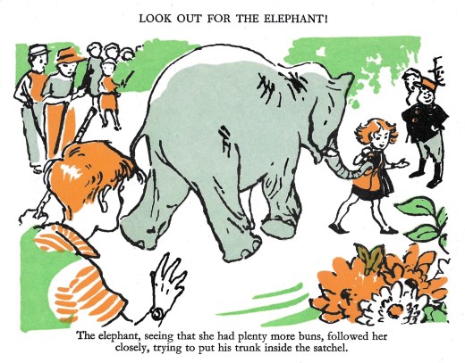 This is one of the shorter stories in the collection. Sara gets to school and hears that there is an elephant loose in the park. Men with sticks have been sent for (is there a brigade of men-with-sticks, ready to be called for such an emergency?) but Sara doesn’t like the idea. She is very worries abut the flowers in the park and so heads off with a load of buns to tempt the elephant safely from the park.