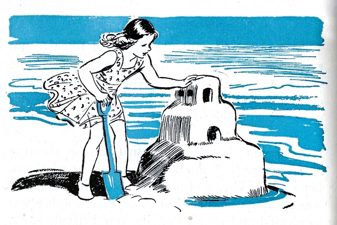 Jill is on the beach building a sandcastle when she shrinks down to miniature size (commons sense would have told her not to eat little sweet-like things that come out of seaweed) and goes exploring. Once inside her sandcastle – and I mean who has never longed to explore a little world like that? – she meets a crab who warns her the tide is coming in. And in it comes, tearing away chunks of the castle until Jill nearly swept away herself. But then she wakes up on the beach, the tide just lapping at her feet, and her castle still standing.