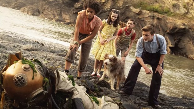 The news was accompanied by this photo, of the Five. I love Dick’s pullover – it definitely rivals anything Paul Child got to wear. Otherwise I am not entirely convinced by the cast here, but it’s very hard to make any sort of judgement from a single snapshot. Dick looks rather young, and would not have been away at the back should anything mysterious be going on, for a start. Would Julian have been in trousers? I imagine he might have – being well into his teens as the series progressed, but I don’t remember that being mentioned. I do rather like the braces, though! Similarly George always tried to dress as a boy, in shorts, shirts and jerseys. She never wore trousers that I know of, and would not have worn a girly peach blouse, either.