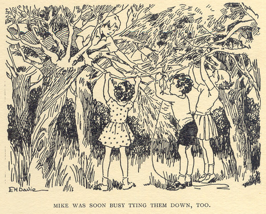 Mike thought it would be a good idea to make two rooms inside Willow House, instead of one big room. The front part could be a sort of living-room, with the larder in a corner, and the back part could be a bedroom, piled with heather and bracken to make soft lying. So they worked at a partition made of willow, and put it up to make two rooms. They left a doorway between, but did not make a door. It was nice to have a two-roomed house!