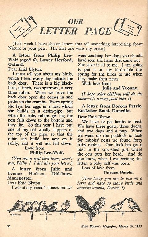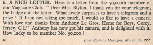 6. A NICE LETTER. Here is a letter from the 50,000th member of our Magazine Club. “Dear Miss Blyton, I thank you for your telegram, the badge and the letter. What lovely surprises to have a telegram and a prize! If I am not asking too much, I would To like to have a camera. With love and thanks from Anthony Le Gros, Home for Boys, Gorey, Jersey, C.I.” Anthony has now got his camera, and is delighted with it. How lucky to be member No. 50,000!