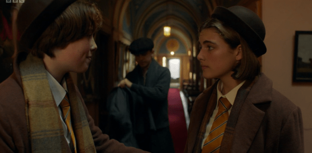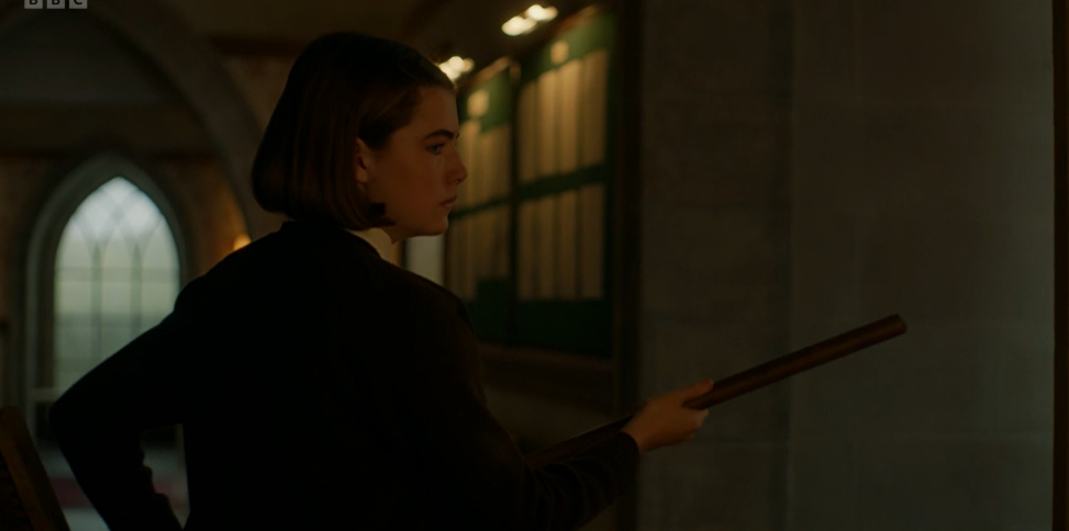 Darrell, being Darrell, grabs a broom and wields it defensively. We see Gwen, alone, up in the attic room, so she can’t have opened the door downstairs. (I’m not sure what Gwen’s plan was – to hide in the attic and live off the hampers hidden up there, in order to save face? Doesn’t she know that Matron and Miss Grayling would kick up a fuss if she disappeared?)