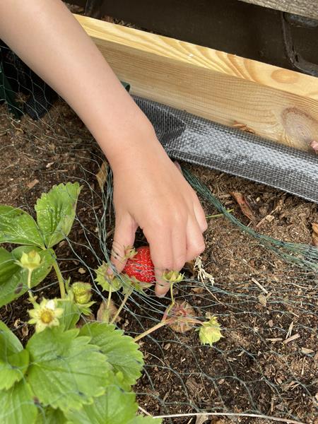 A few of our strawberries have ripened (and been eaten) and our potatoes have finally started peeking out of the compost and another layer has been added.