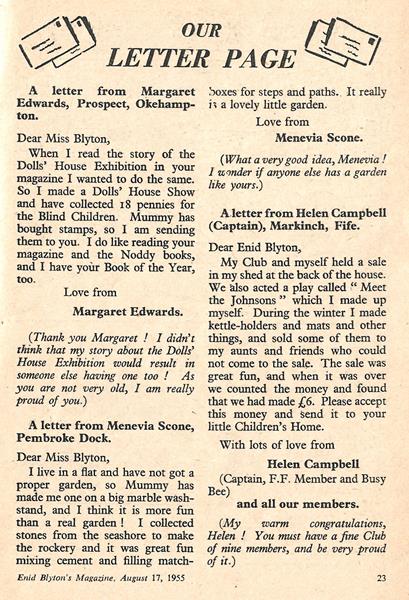 When I read the story of the Dolls’ House Exhibition in your magazine I wanted to do the same. So I made a Dolls’ House Show and have collected 18 pennies for the Blind Children. Mummy has bought stamps, so I am sending them to you. I do like reading your magazine and the Noddy books, and I have your Book of the Year, too.