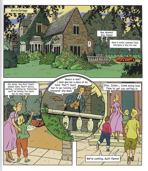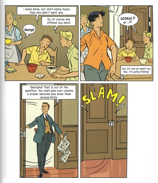 In just 76 words and four pictures it establishes the children are Julian, Dick and Anne, and they have been dropped off for the first time at their aunt and uncle’s house for the summer. We see that Aunt Fanny is kind, and that Uncle (no name given, yet) is cross with Georgina for not being there. This was several pages in the book, but requires to be cut down immensely for a graphic novel.