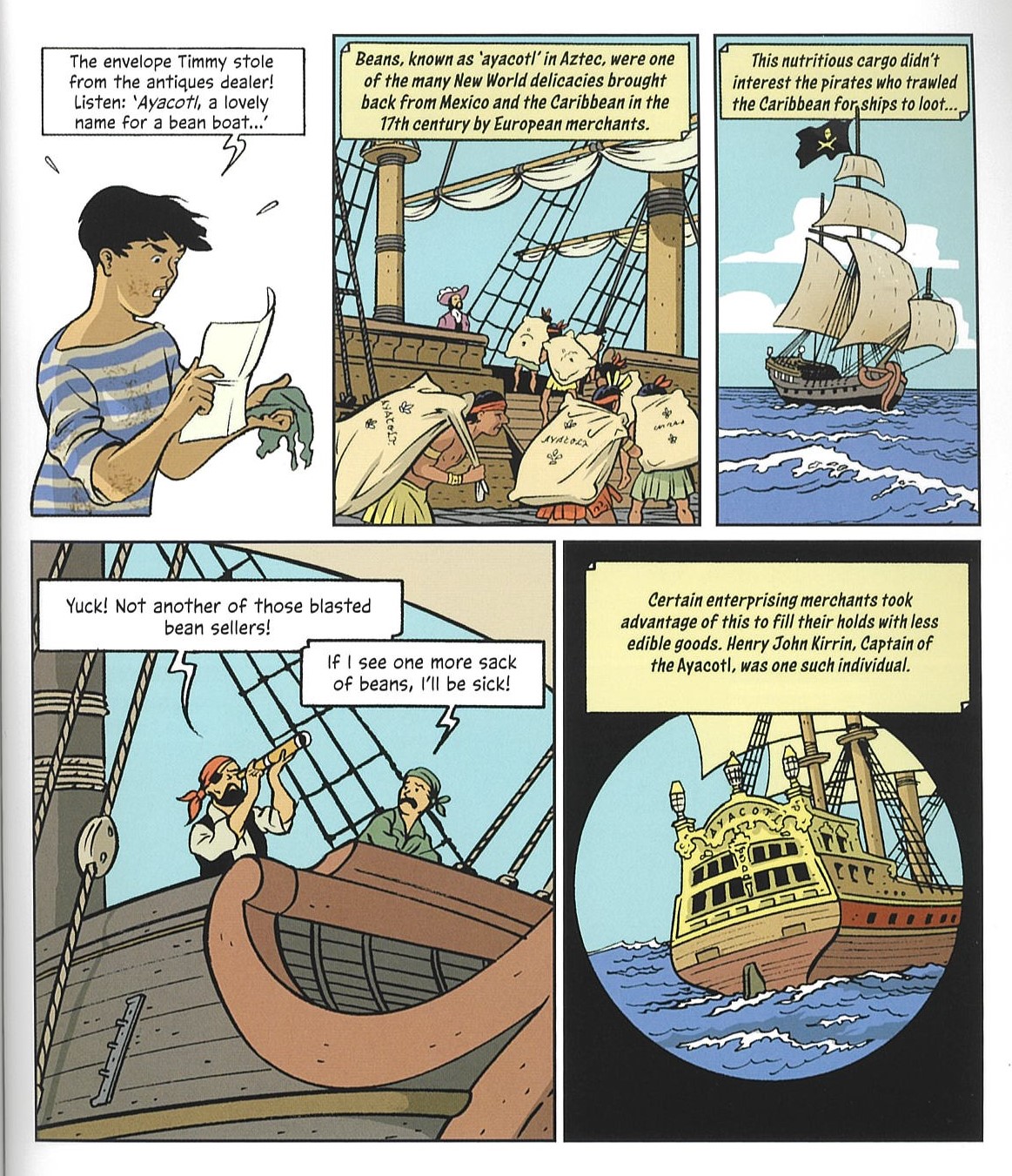 Sadly they don’t throw the box out of the window and Uncle Quentin doesn’t confiscate it, they just lever it open with a crowbar. Inside is a map of Kirrin Castle. They then realise that the envelope Timmy took is about the Ayacotl. A page and a half is given to explaining how certain merchants pretended to be carrying beans to the New World to get past pirates who were after more interesting types of cargo, with Henry John Kirrin’s ship making its last journey stuffed with Aztec gold instead of beans.