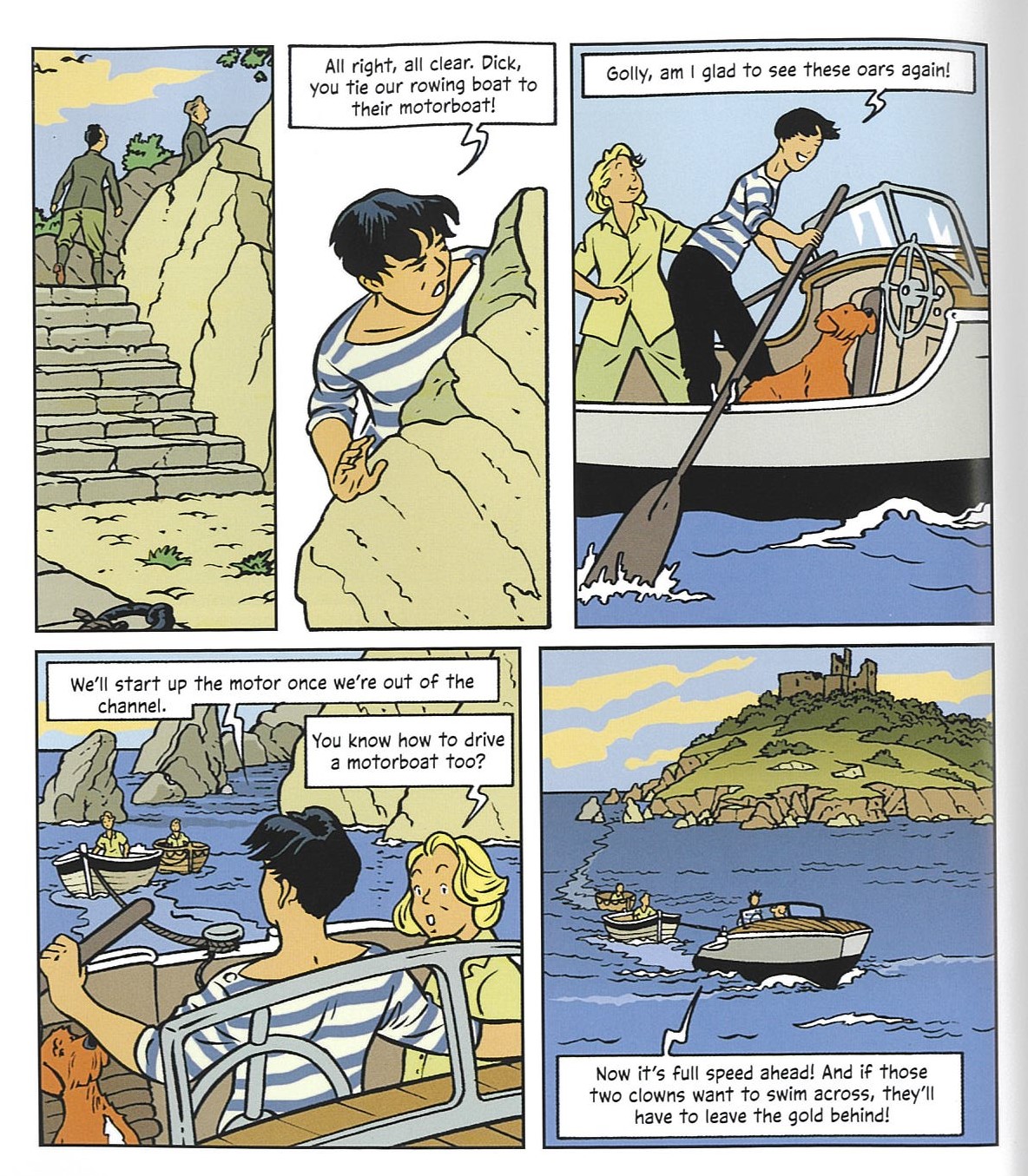 The cousins making friends with George is glossed over in a caption simply saying they were so nice they broke through her prickly shell. George then tells them Kirrin Island is hers, and they meet Timmy as Alf has brought him down to the beach.