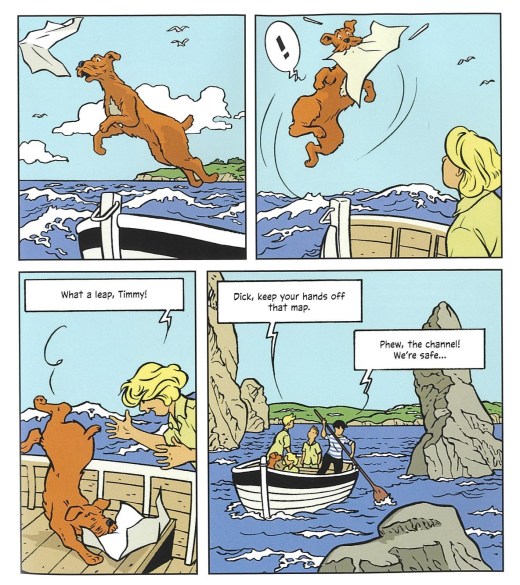 Julian is shown as bossy, but not merely in the sensible older brother way of the books. He doesn’t have a ton of dialogue but it is mostly instructions on what they/the others must do. He isn’t nearly as likeable as in the books. On page 19 he abruptly shouts That’s quite enough, you two! as Dick makes a snide response to Anne, and on p39 he says On the contrary, young Dick! In the immortal words of Archimedes: ‘Give me a lever, and I’ll move the world.’ He is obviously paraphrasing there as that’s not the full quote, but either way, he comes across as an unpleasant know-it-all.