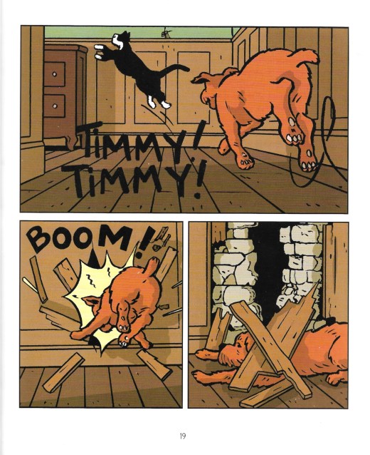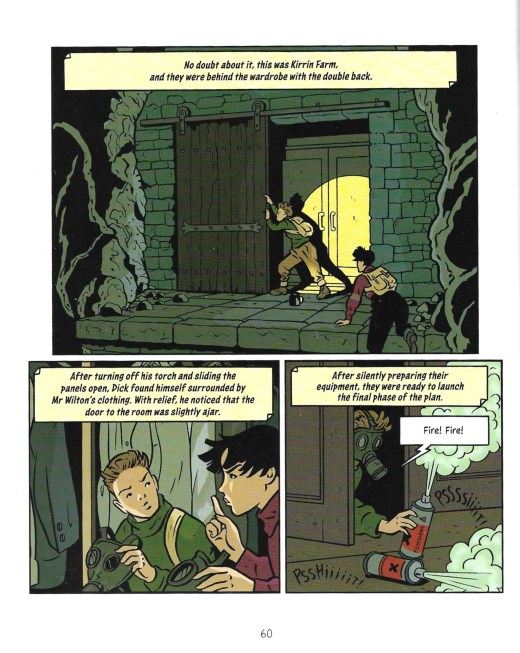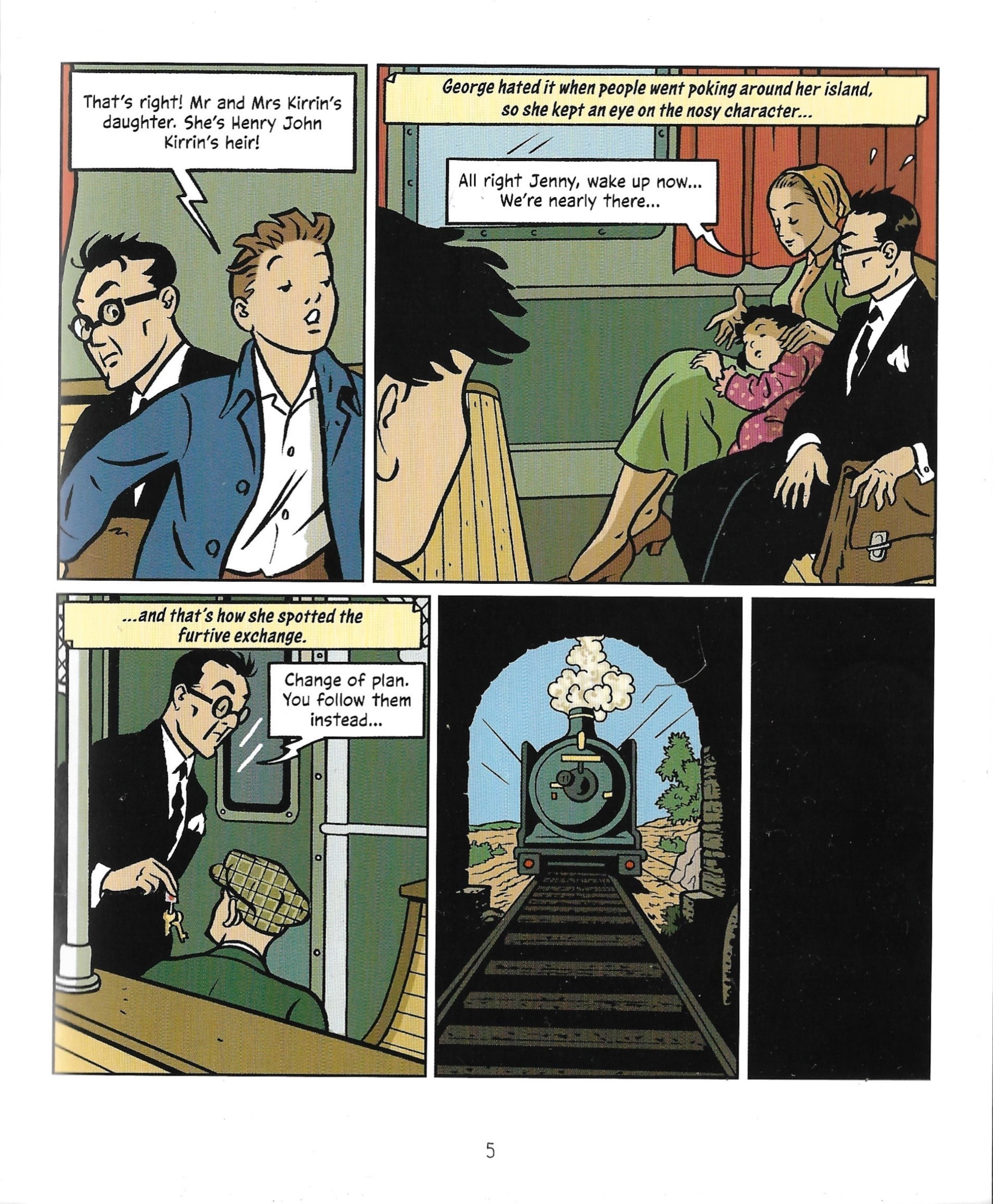 Mr Roland is in his pyjamas and is obviously staying at Kirrin Cottage, and says that Timmy is too dangerous to be roaming free. The next panel says that George learned that Mr Roland is staying at the farm. It’s not clear why, and the next night Uncle Quentin’s report is stolen. Are we supposed to think that Mr Roland and Mr Wilton have found the secret passage and used it? None of it is very clear.