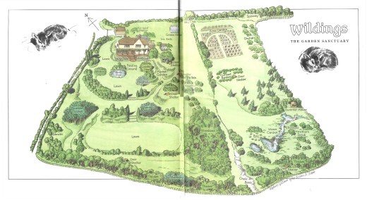 You know how I love a book with a map in it. It’s a very large map and as even a single page of this book is too big for my A4 scanner, this is the best I could do – combining several scans into one image. I think it is enough to give you an overview of the size and scale of the gardens as well as the key features. Click on it to see a much larger version.