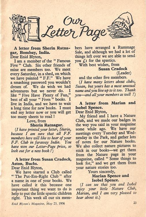 I am a member of the “Famous Five” Club. Six other friends of mine are members too. We meet every Saturday, in a shed, on which we have painted “F.F.” We have a smashing password you wouldn’t dream of. We do wish we had adventures but we never do. I like “Five Have Plenty of Fun,” best of all your “Fives ” books. I live in India, and we have to wait a long time for new books. I must end my letter now or you will get too many sheets to read!