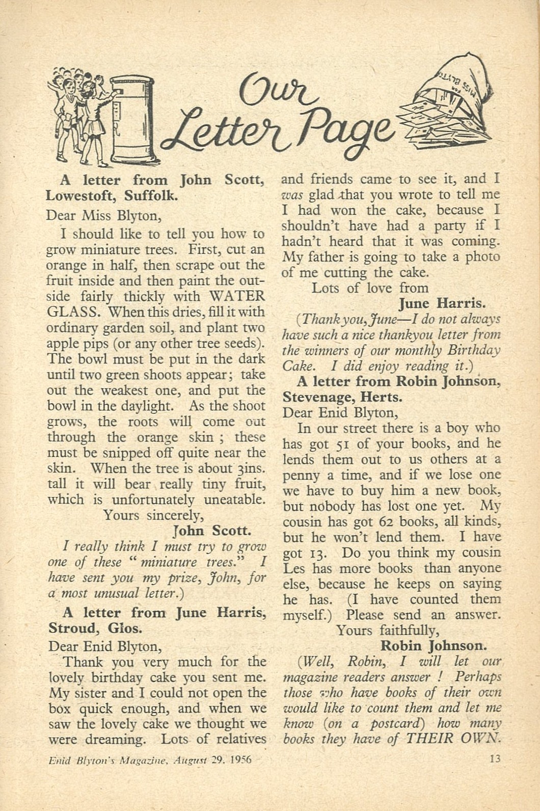 I should like to tell you how to grow miniature trees. First, cut an orange in half, then scrape out the fruit inside and then paint the outside fairly thickly with WATER GLASS. When this dries, fill it with ordinary garden soil, and plant two apple pips (or any other tree seeds). The bowl must be put in the dark until two green shoots appear; take out the weakest one, and put the bowl in the daylight. As the shoot grows, the roots will come out through the orange skin; these must be snipped off quite near the skin. When the tree is about 3ins. tall it will bear really tiny fruit, which is unfortunately uneatable. Yours sincerely,