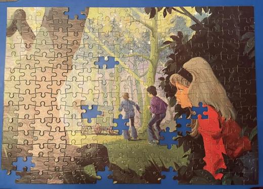 This is a 1975 Whitman 224 piece puzzle of Five Fall Into Adventure. There were three others made – Five On a Treasure Island, Five Go to Smuggler’s Top and Five Go to Demon’s Rocks.