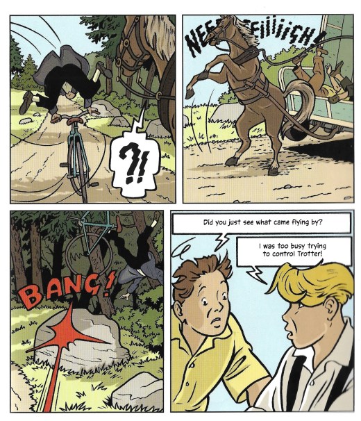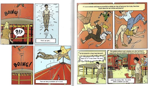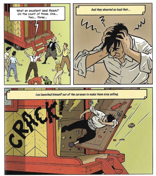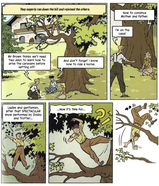 While in the original novel we of course enjoy their meandering route, a further 16 pages of this graphic novel are used before they reach the circus. Several of those pages are used to show them nearly crashing into a cyclist (which seems to be a popular plot point in these adaptations).