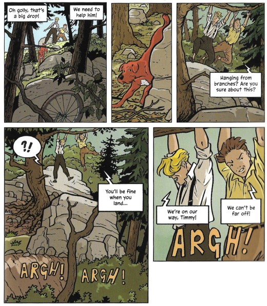 Five pages pass while they persuade their mother to let them go, mixed with Dick doing acrobatics in a tree.