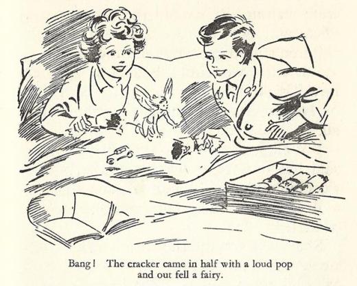 Twelve fairies are passing and see how miserable the children are, and end up hiding in a pack of crackers to avoid the mother when she checks on the children. So of course when the children pull the crackers along with the hat and little toy, they discover a fairy in each one!