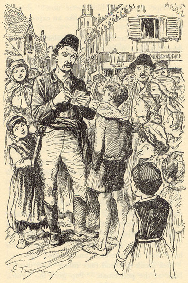Julian’s the one out in the snow, wearing a white Mackintosh and following Mr Roland. He also has a dramatic discovery – the tutor hands some papers to the two artists.